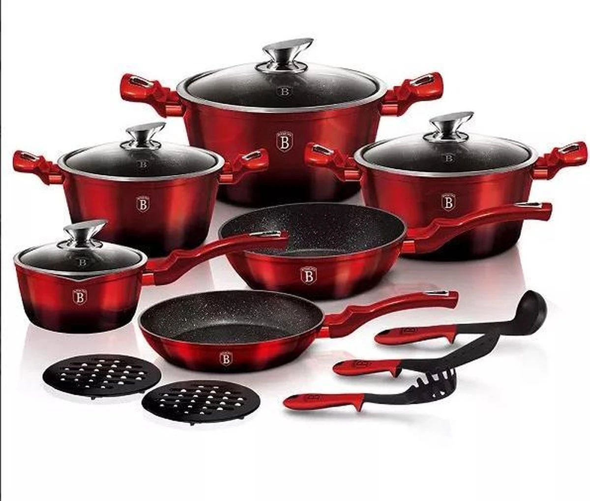 Aluminium Pannen Set bestaat uit Koekenpannen ร24×7 2,3 liter en ร28x12cm 2,4 liter kookpannen ร20x10cm 2,5liter, ร24x12cm 4,1 liter, ร28x12cm 6,1 liter allemaal met glazen deksel Steelpan ร16x8cm 1,2 liter met glazen deksel. Accessoires: Soeplepel, spatel, spaghettilepel en 2 onderzetters. Kleur is metallic Black Burgundy. 3 lagen marmer coating. Deksels hebben een Ergonomische soft touch handvat. Pannen zijn geschikt voor inductie.