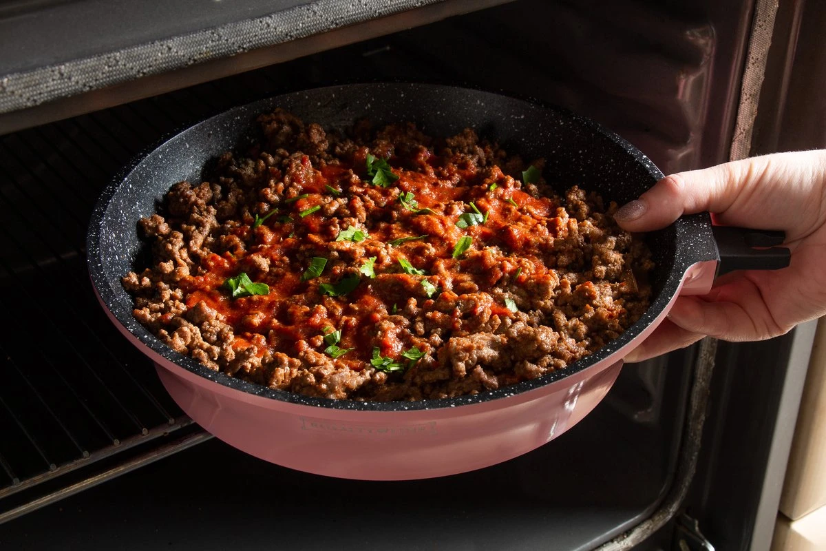 De gezonde minerale anti-aanbaklaag is vrij van PFAS, PFOA, lood en cadmium, zodat er nooit giftige dampen vrijkomen, zelfs niet als hij per ongeluk oververhit raakt.