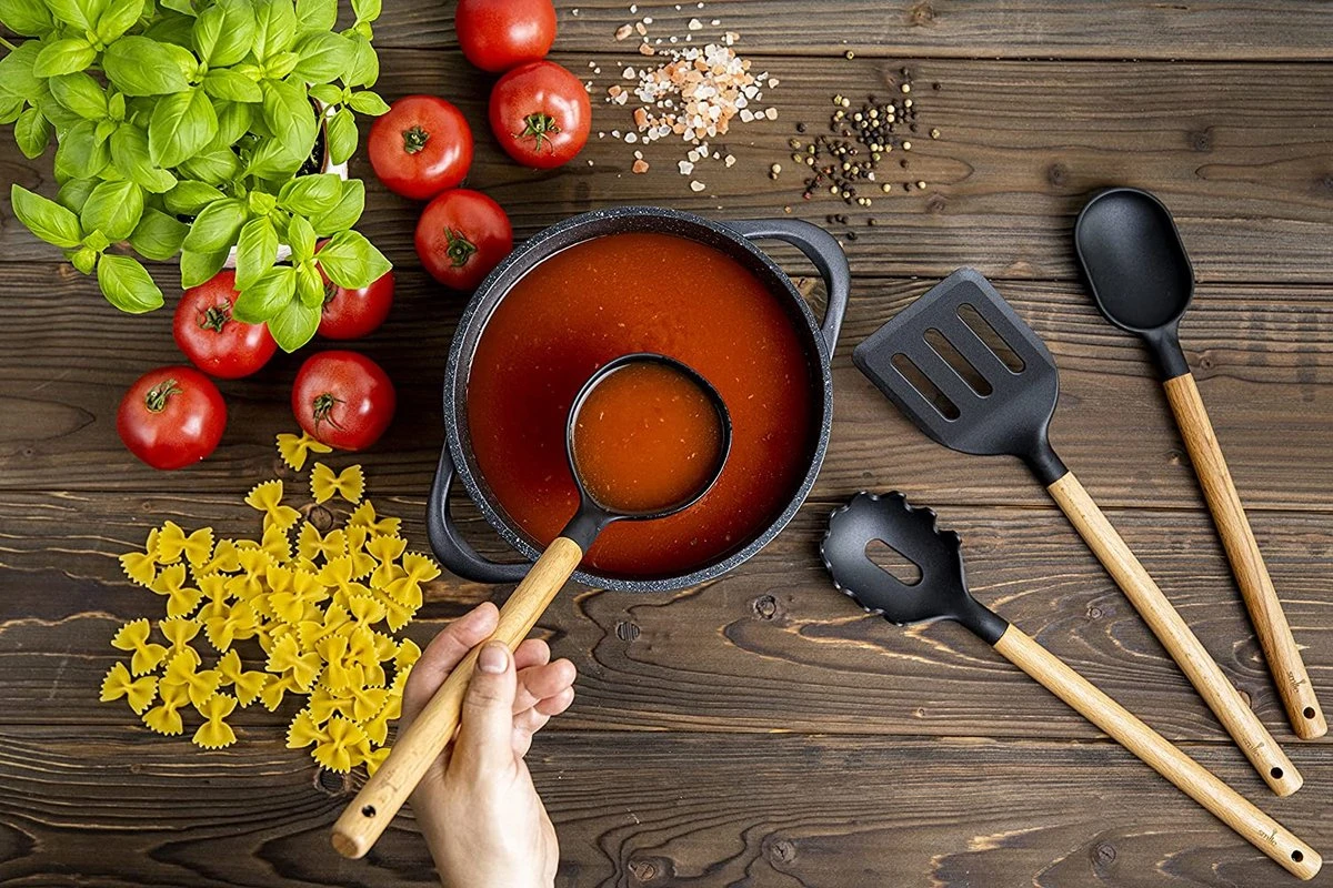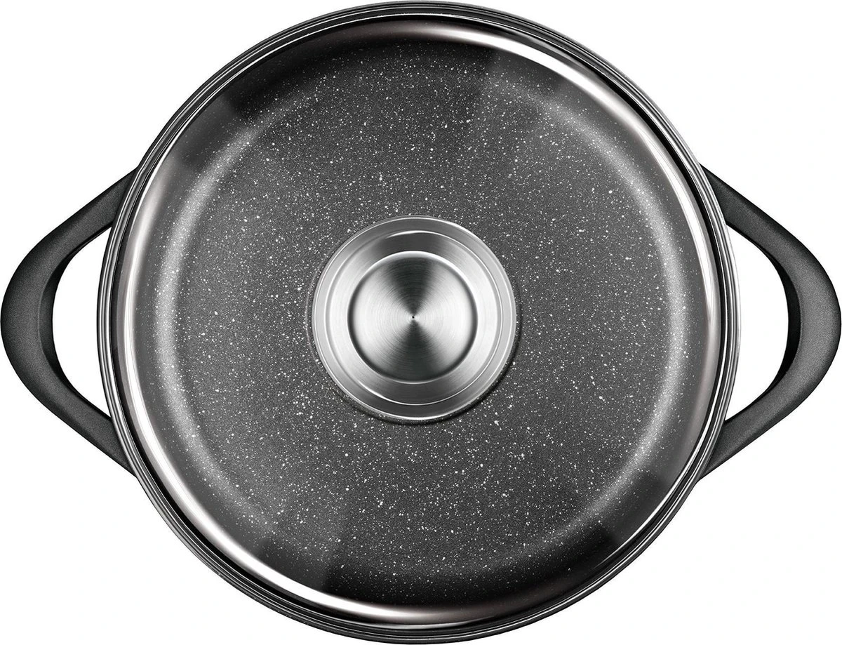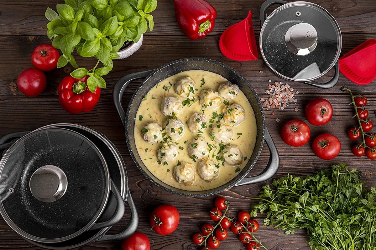 Deze prachtige pannenset van het merk Smile geeft iedere keuken een upgrade. De pannen zijn namelijk geschikt voor iedere kookplaat, waaronder inductie, gas en elektrisch. Ook wanneer jij veranderd van huis of keuken, kun jij deze pannen dus gewoon blijven gebruiken. Het zwarte materiaal en de glazen deksels zorgen voor een luxe en stijlvolle uitstraling, welke kleur jouw keuken ook is. Naast het mooie uiterlijk zijn de pannen ook nog eens van topkwaliteit; ze zijn allen voorzien van een anti-aanbaklaag, roestvrij stalen knoppen en dikke wanden voor een gelijkmatige warmteverdeling. De perfecte pannenset dus om in te koken, frituren, stoven รณf braden.