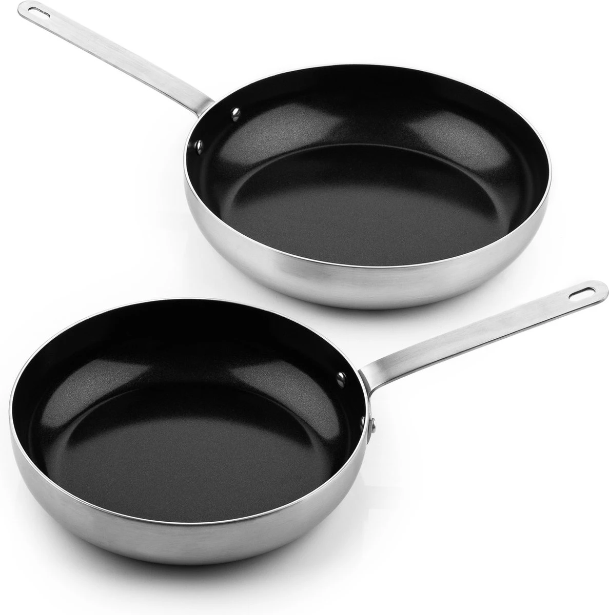 Deze unieke combideal van twee koekenpannen zijn ideaal voor het gezond bereiden van aardappeltjes, groenten, vlees en vis. We zeggen gezond, aangezien de pannen een unieke keramische antiaanbaklaag bevatten. Deze laag is niet alleen vrij van schadelijke stoffen, maar zorgt er ook nog eens voor dat je minder olie en/of boter nodig hebt.