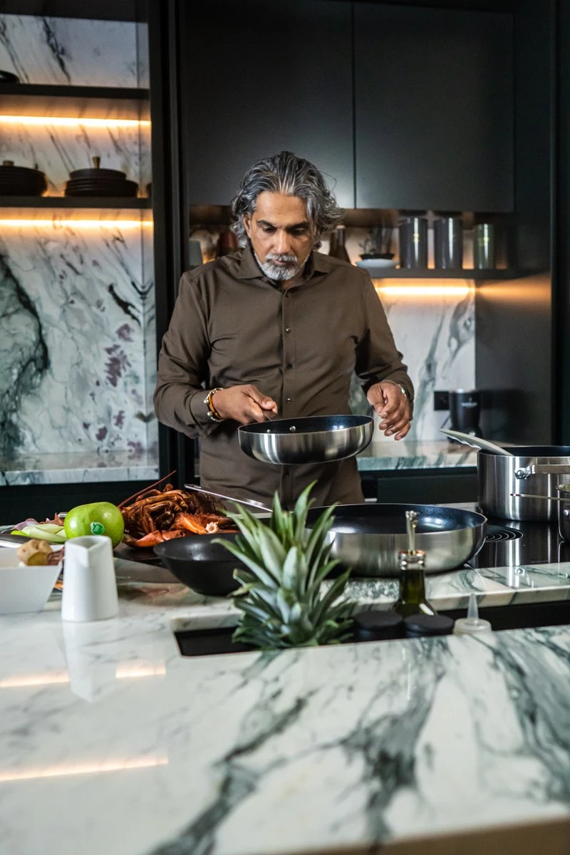 De Soenil by ISENVI lijn is ontwikkelt in samenwerking met twee Michelin sterrenchef Soenil Bahadoer. We nemen je graag even mee in het leven van Soenil. Hij is opgegroeid in een Surinaams-Hindoestaanse cultuur, waar zijn liefde voor koken is begonnen. Eten brengt gezelligheid en dat wil hij dan ook maar al te graag met de mensen delen. Soenil is eigenaar van restaurant de Lindenhof in Nuenen, waar de pannen zijn rechterhand zijn. Soenil geeft aan dat er niks belangrijkers is dan het gebruik van goede pannen. Koken hoeft niet moeilijk te zijn, als je maar de juiste gereedschappen ervoor gebruikt. Bahadoer is klassiek opgeleid maar werkt met veel verschillende smaken en specerijen uit alle windstreken. Daarom is ISENVI op zoek gegaan om een pannenset te ontwikkelen die deze smaken tot zijn recht laat komen.