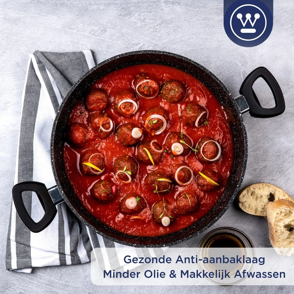 De Westinghouse Zwart Marmer Hapjespan 28cm mag niet ontbreken aan jouw pannencollectie. De hapjespan is ideaal voor het bereiden van bijvoorbeeld eenpansgerechten, een lekkere risotto, paella of een heerlijke pastasaus. De pan is gemaakt uit aluminium en licht in gewicht. Zo verplaats je de hapjespan gemakkelijk van de warmtebron rechtstreeks naar de tafel.